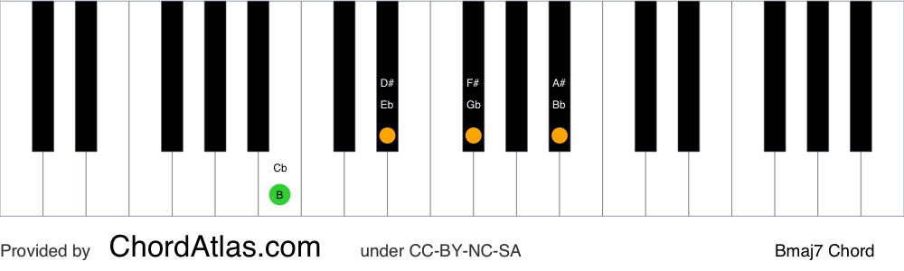 The B major seventh chord is a 4-note chord consisting of the notes B, D#, F# and A#.