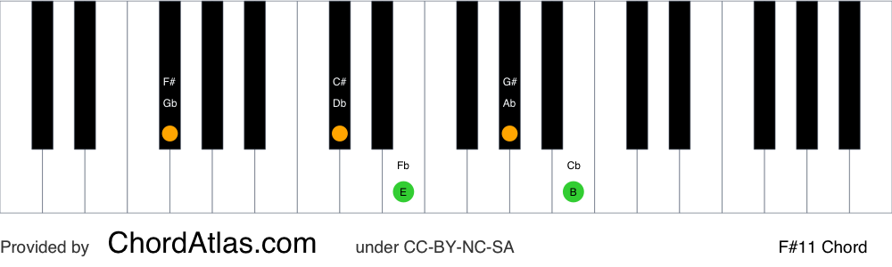 The F sharp eleventh chord is a 5-note chord consisting of the notes F#, C#, E, G# and B.